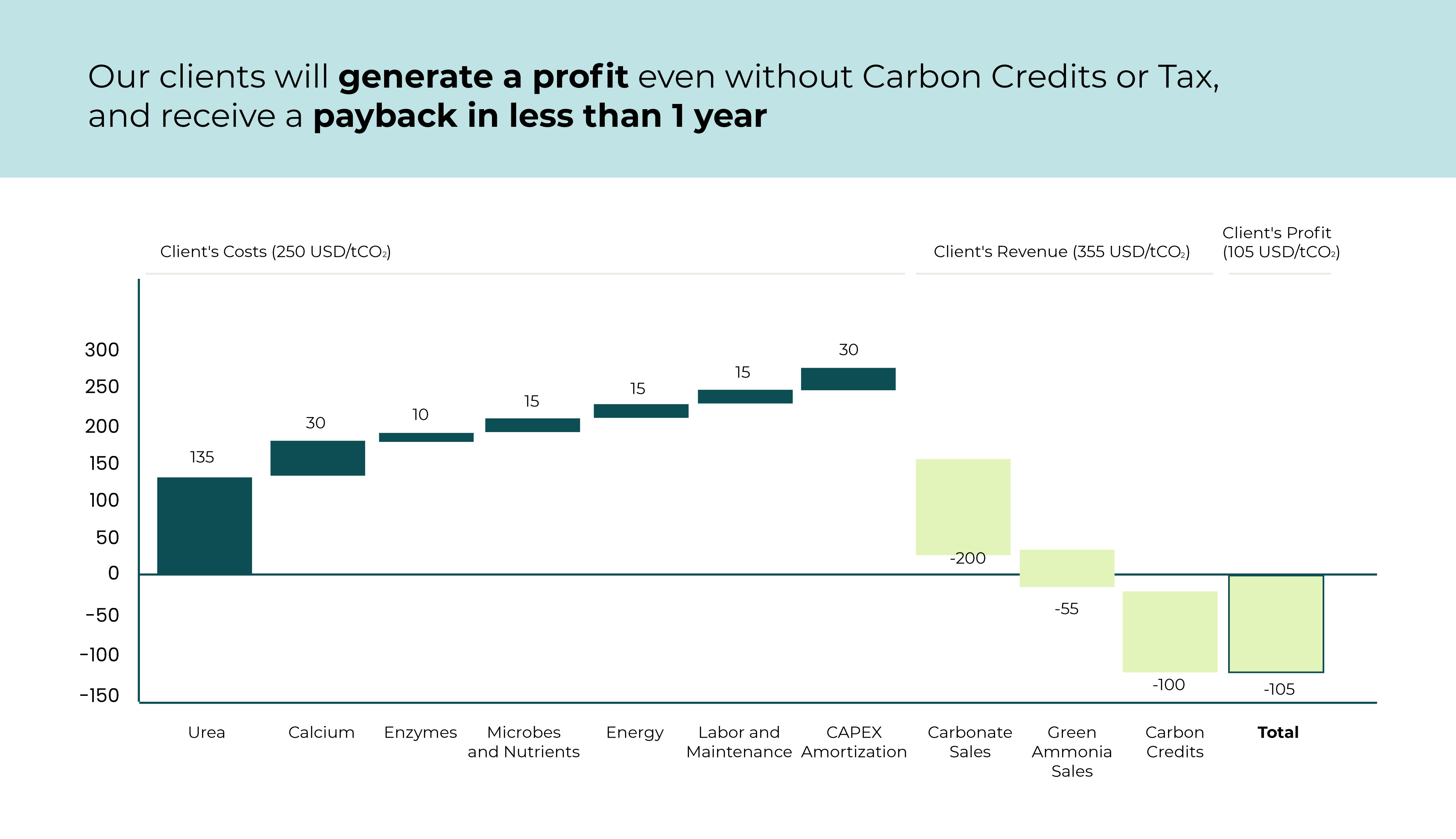 Our patented (pending) bio-catalytic process uniquely creates value from CO₂, turning a liability into revenue streams (CaCO₃, Green Ammonia) and establishing a new economic model for industrial decarbonization.